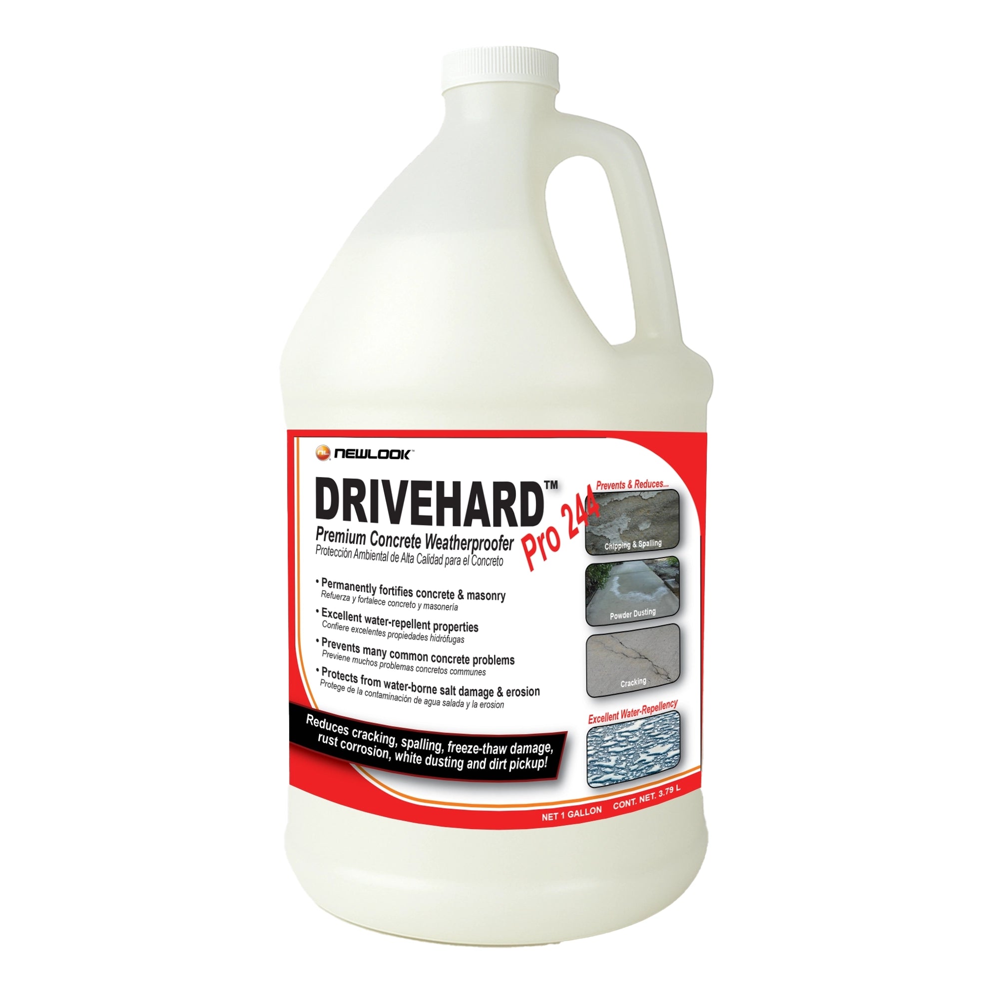 DriveHard Pro 244 is a premium grade concrete and masonry weatherproofer and fortifier. The proprietary formula densifies, strengthens and makes the surface water-repellant by penetrating into and chemically reacting with the unique chemical properties of the substrate. DriveHard Pro 244 chemical reaction creates a bond that permanently increases the lifespan of concrete and masonry by preventing and reducing damage caused by common problems, including extreme weather conditions (e.g. freeze-thaw cycles). The water-based, high-solids blended Lithium Densifier based formula creates a breathable, yet stronger and water-repellent surface that is more resistant to abrasion and water-dissolved salts (alkali). DriveHard Pro 244 does not create a film on the surface that would trap moisture vapor; it does not change the texture; it leaves a natural-looking and more durable finish. When used in the polishing process, will deepen clarity and increase reflectivity, while remaining breathable.